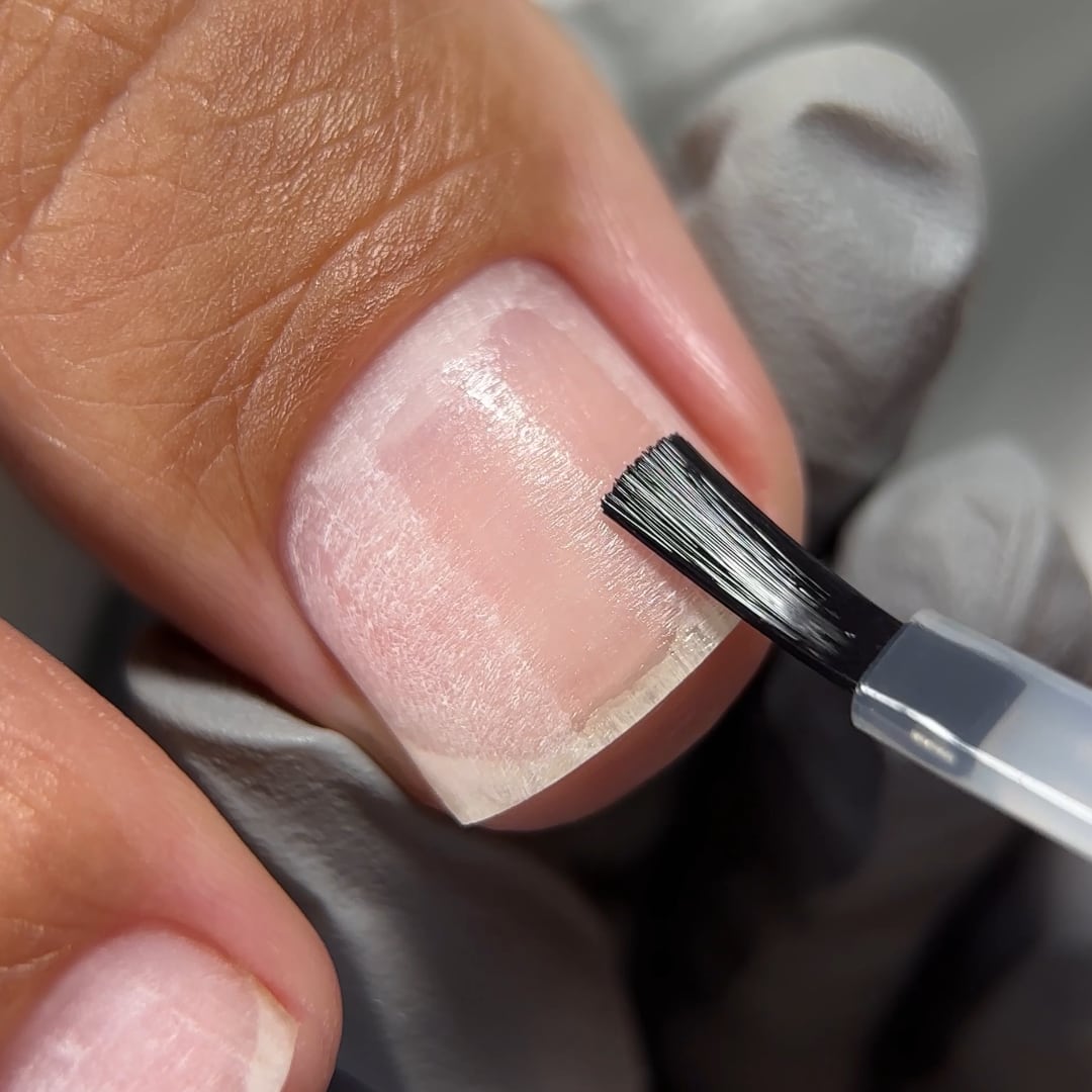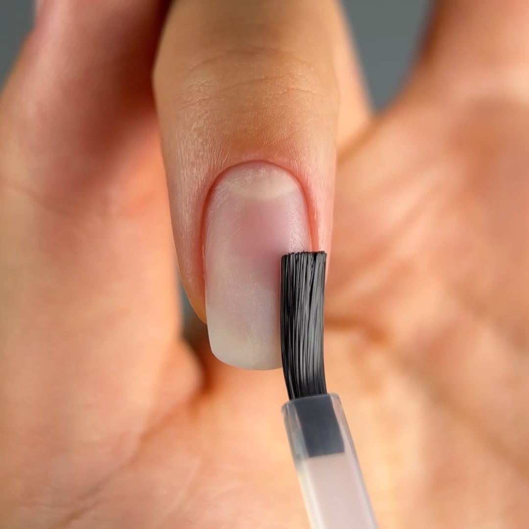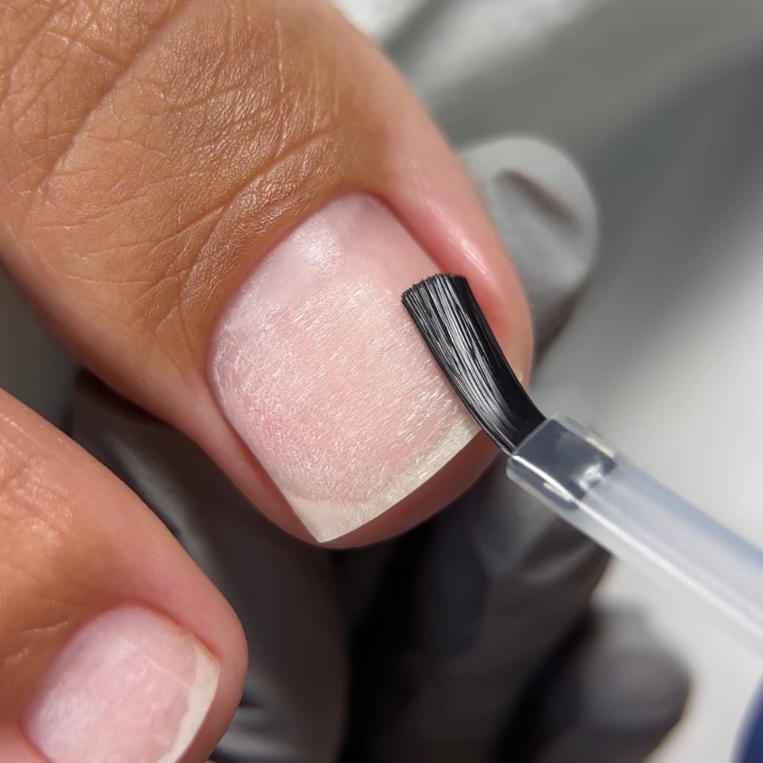Close-up of a matte French manicure using shades from Paloma's Nude Collection, featuring soft nude tones as the base with crisp white French tips. This elegant and timeless design highlights the versatility of highly-pigmented, long-lasting nude gel polishes, perfect for a classic French manicure.